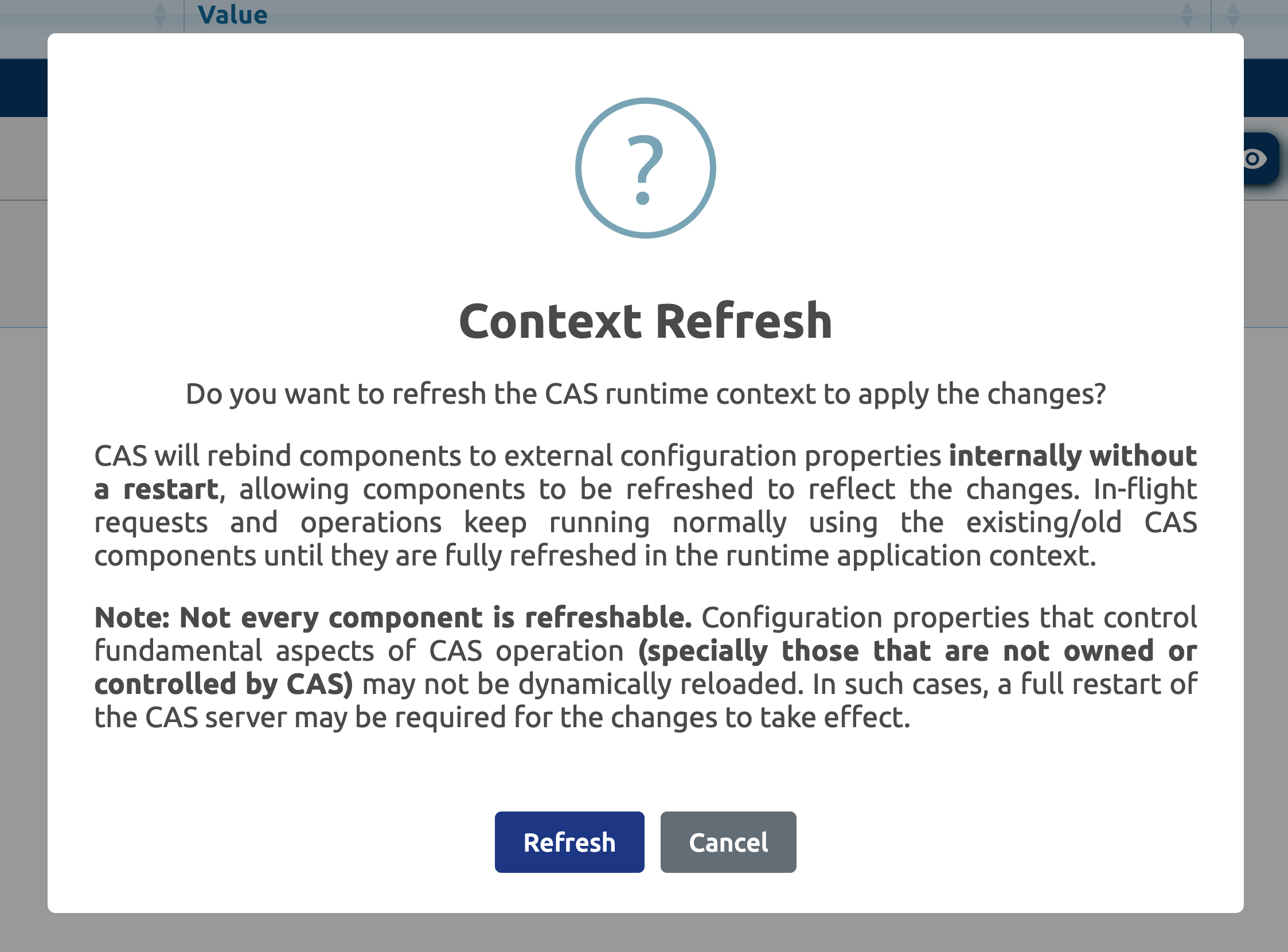 Important: remember that just because a property exists in a configuration source, it does not mean that CAS will be able to immediately notice the change to start using it. The configuration source is mainly kept in isolation and separate from the active runtime context, and can be changed and updated as many times as necessary until you’re ready to put changes into effect. When the time is right, you can ask CAS to refresh itself:
